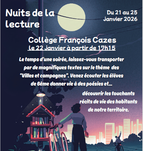 Par admin francois-cazes, publié le dimanche 28 janvier 2024 10:27 - Mis à jour le mardi 20 janvier 2026 14:07Ce jeudi 22 janvier , le collège François Cazes ouvre ses portes aux enfants, à leurs parents, et à tous les habitants du secteur dans le cadre des Nuits de la Lecture sur le thème des "villes et campagnes". Cliquez pour découvrir le programme. -