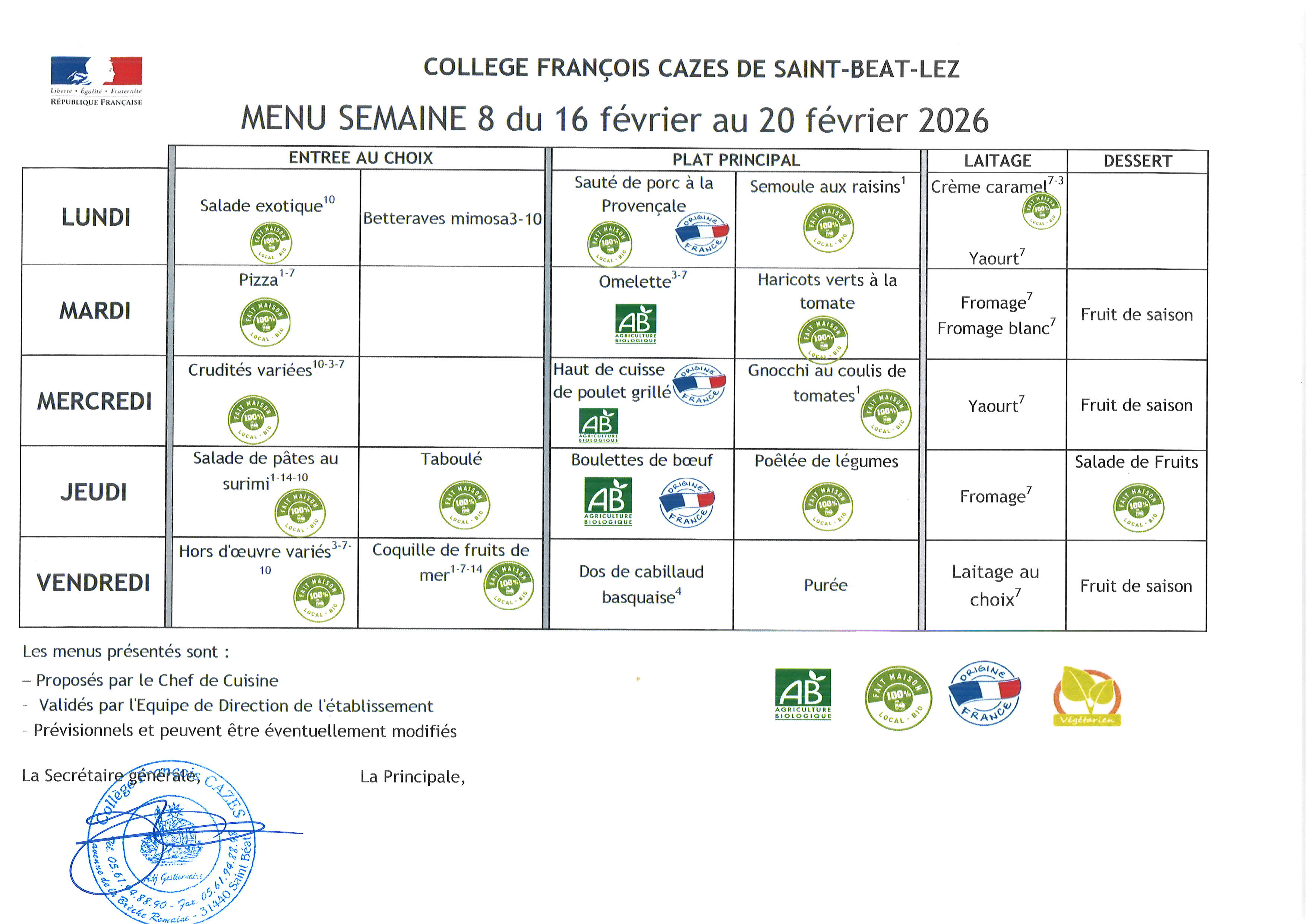Menu du 16 au 20 février 2026