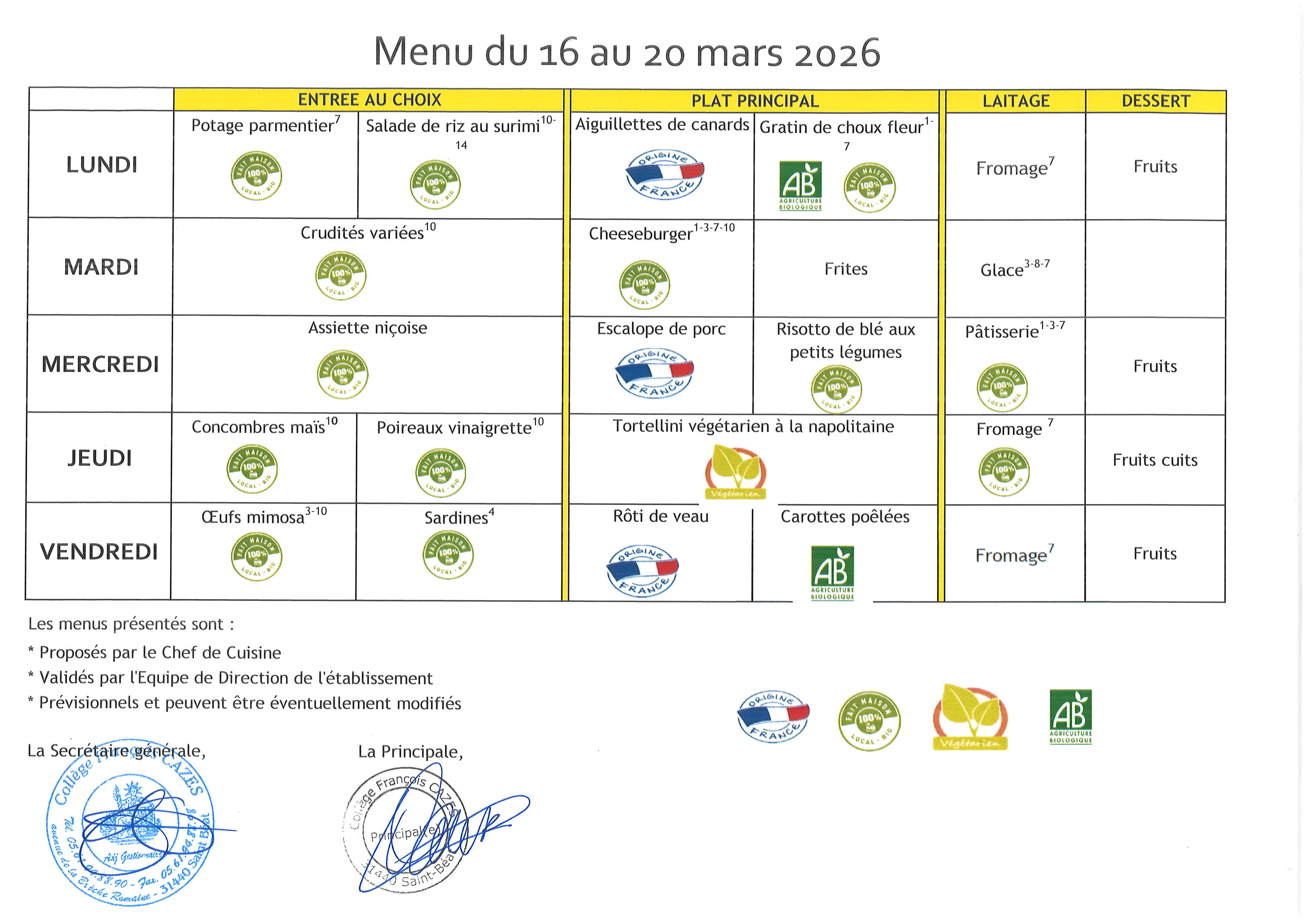 Menu du 16 au 20 mars 2026