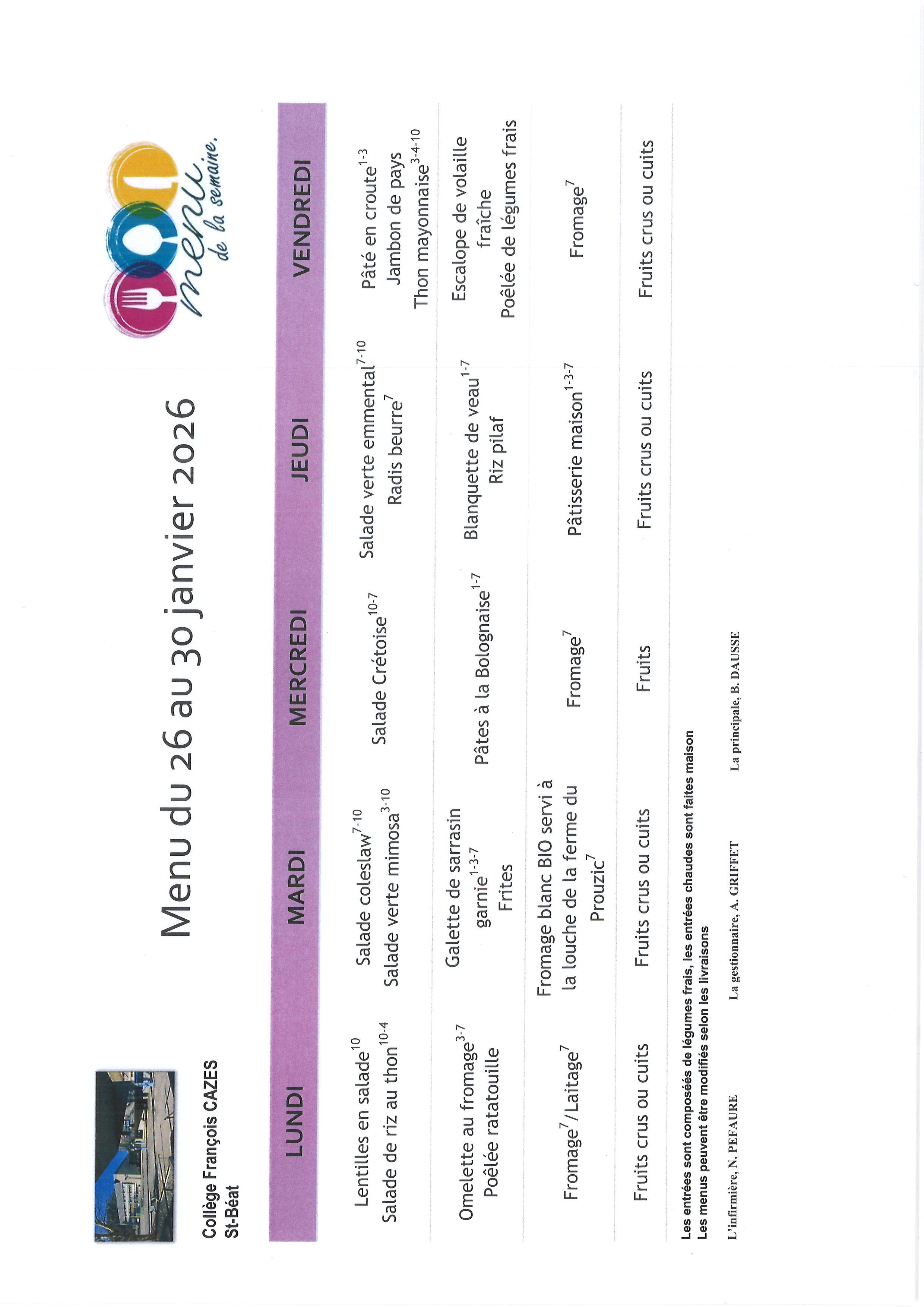 Menu du 26 au 30 janvier 2026